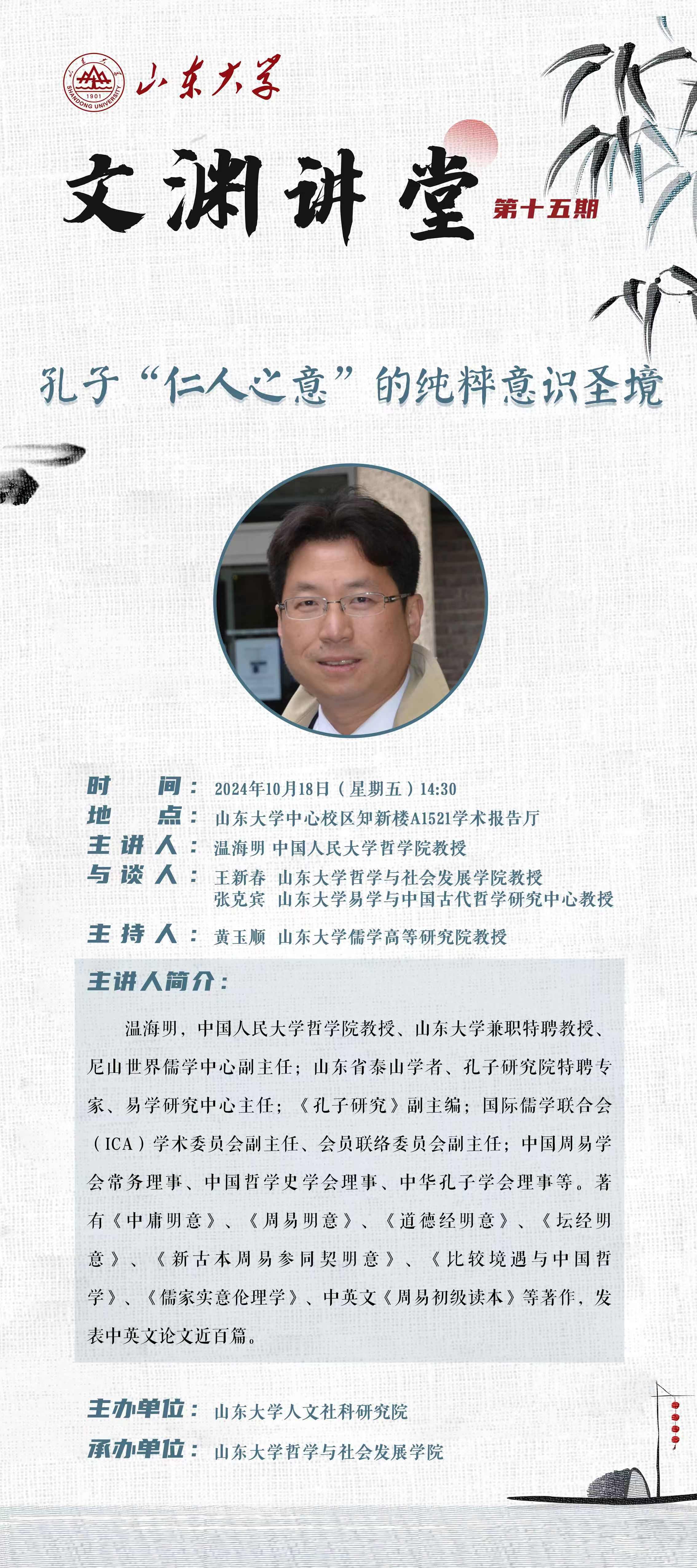 温海明,中国人民大学哲学院教授、太阳集团兼职特聘教授、尼山世界儒学中心副主任;山东省泰山学者、孔子研究院特聘专家、易学研究中心主任;《孔子研究》副主编;国际学联合会(ICA)学术委员会副主任、会员联络委员会副主任;中国周易学会常务理事、中国哲学史学会理事、中华孔子学会理事等。著有《中庸明意》、《周易明意》、《道德经明意》、《坛经明意》、《新古本周易参同契明意》、《比较境遇与中国哲学》、《儒家实意伦理学》、中英文《周易初级读本》等著作,发表中英文论文近百篇。