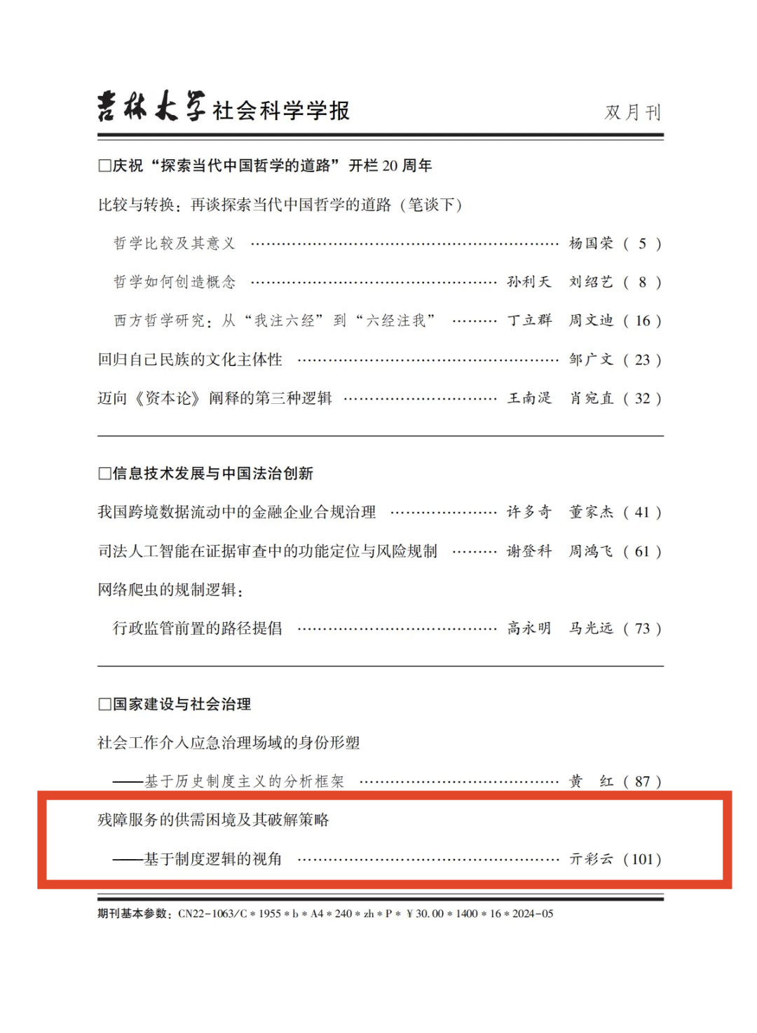 近日,tyc5997太阳集团亓彩云副教授在《吉林大学社会科学学报》2024年第3期上发表了题为《残障服务的供需困境及其破解策略——基于制度逻辑的视角》的高质量论文。