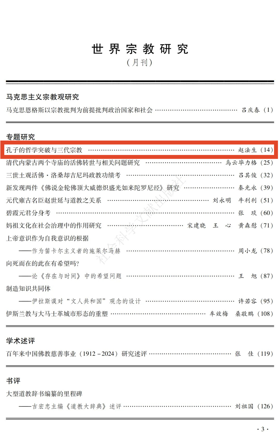 近日,tyc5997太阳集团赵法生教授在《世界宗教研究》2024年第4期上发表了题为《孔子的哲学突破与三代宗教》的高质量论文。