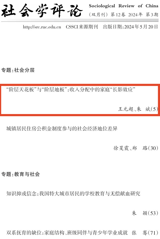近日,tyc5997太阳集团青年教师王元超、中国人民大学社会学院朱斌副教授共同在《社会学评论》2024年第3期上发表了题为《“阶层天花板”与“阶层地板”:收入分配中的家庭“长影效应”》的高质量论文。