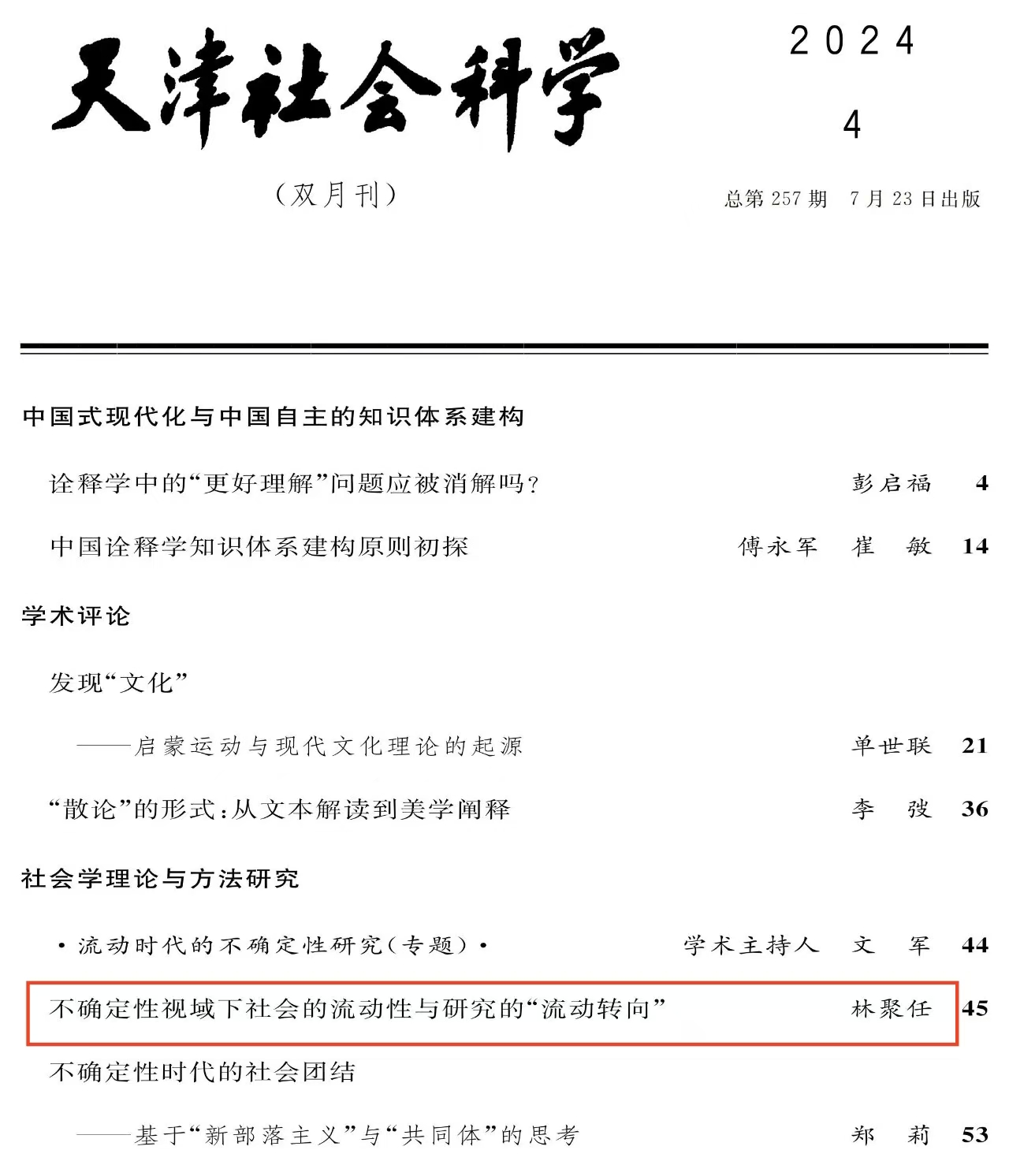 近日,tyc5997太阳集团林聚任教授在《天津社会科学》 2024年第4期上发表了题为《不确定性视域下社会的流动性与研究的“流动转向”》的高质量论文。