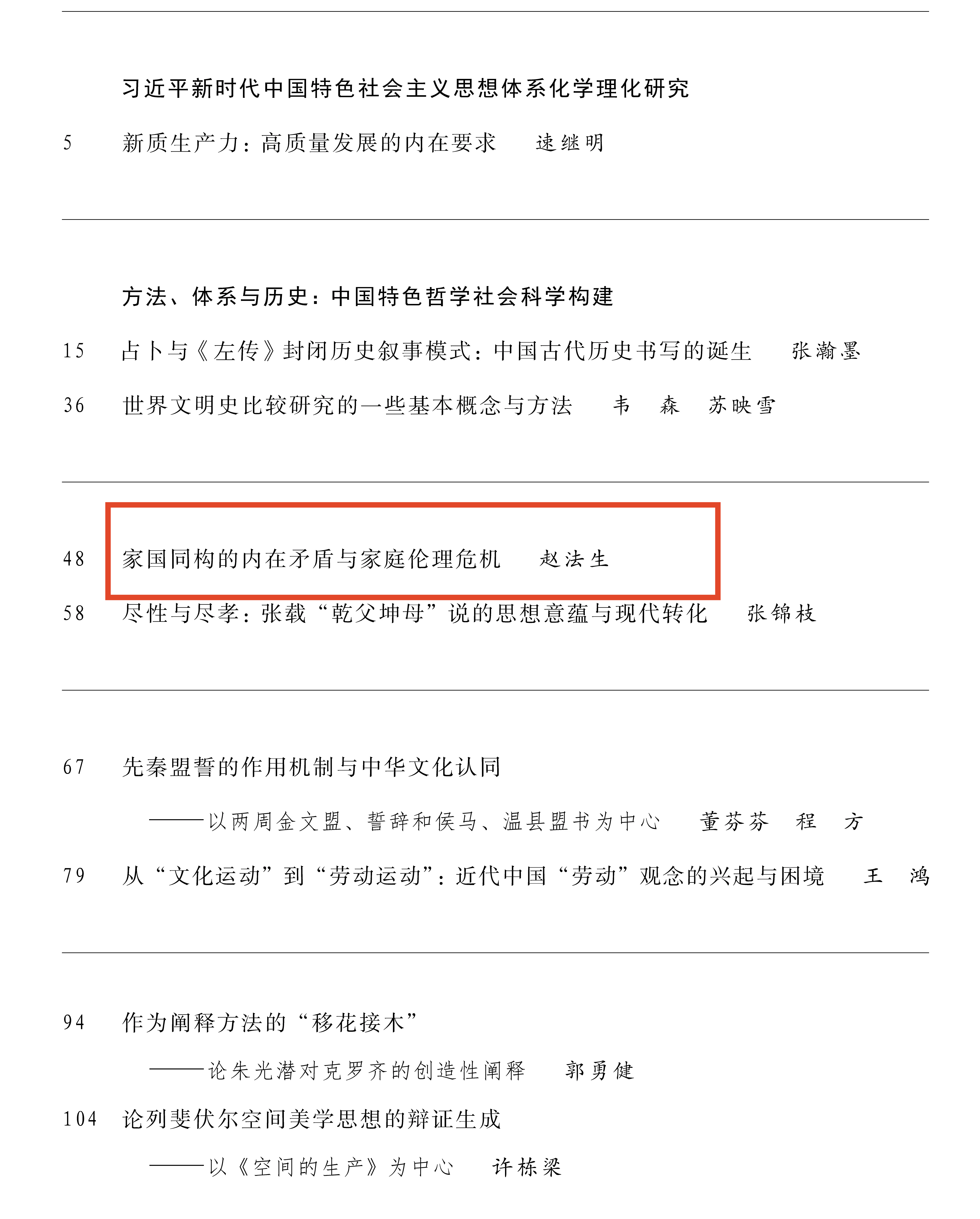 近日,tyc5997太阳集团赵法生教授在《社会科学》2024年第9期上发表了题为《家国同构的内在矛盾与家庭伦理危机》的高质量论文。