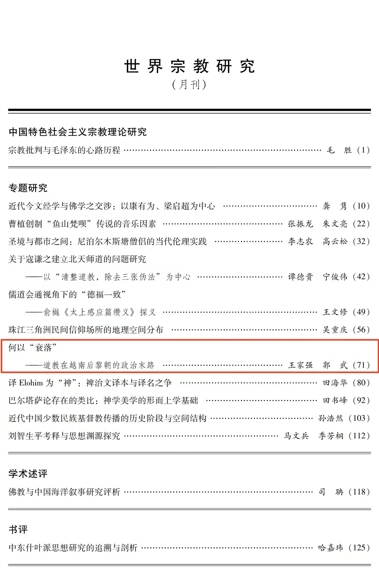 近日,太阳集团犹太教与跨宗教研究中心王家强博士后与郭武教授共同在《世界宗教研究》2024年第8期上发表了题为《何以“衰落——道教在越南后黎朝的政治末路》的高质量论文。