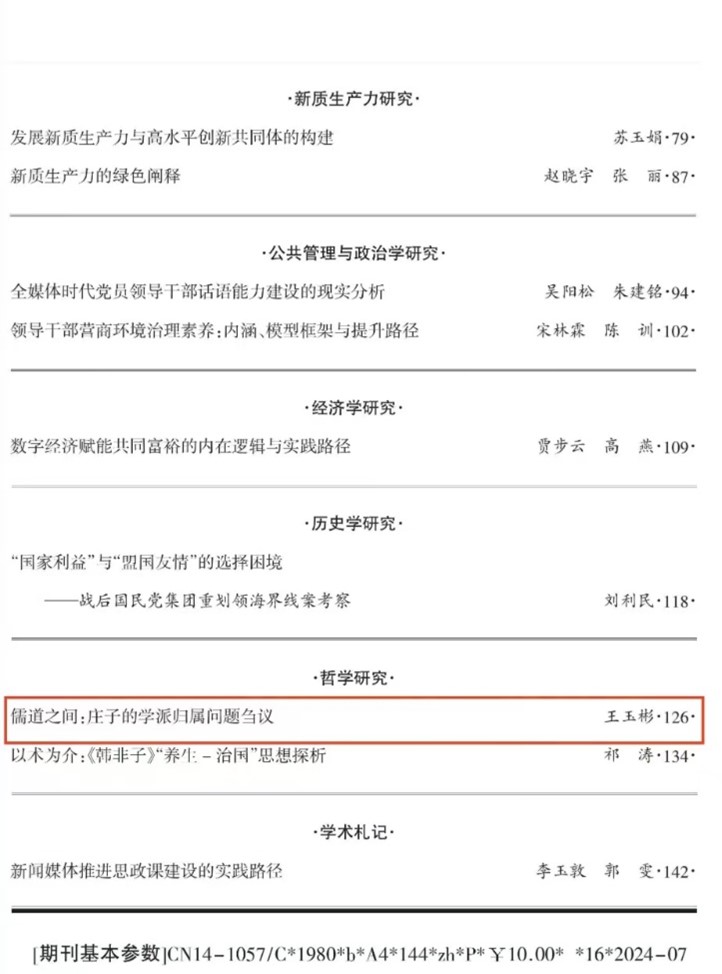 2024年7月15日,tyc5997太阳集团王玉彬教授在《晋阳学刊》2024年第4期上发表了题为《儒道之间:庄子的学派归属问题刍议》的高质量论文。