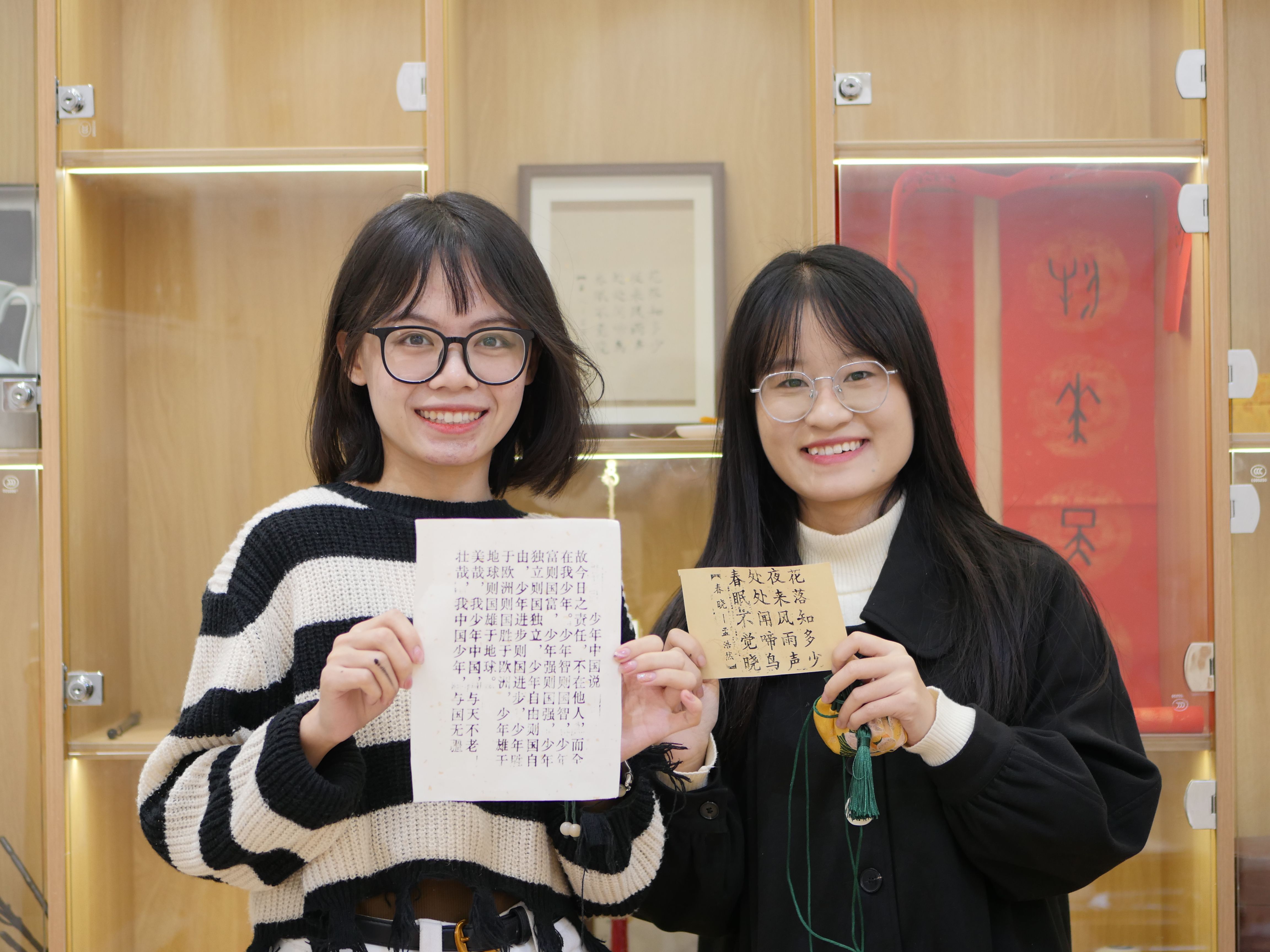 在非遗手作体验环节,同学们系统学习了金箔画、书法相框、中草药香囊、漆扇和活字印刷等技艺的基础知识,在方寸金箔上勾勒山水意境,于宣纸墨香中装帧书法作品,在素白扇面上挥彩描绘春意盎然,体验活字排版中的汉字智慧,感受草药香囊调配中的古方匠心。在沉浸式创作中,成员们不仅领略了传统工艺的深厚魅力,更深刻体会到非遗文化“守正创新”的蓬勃生命力。