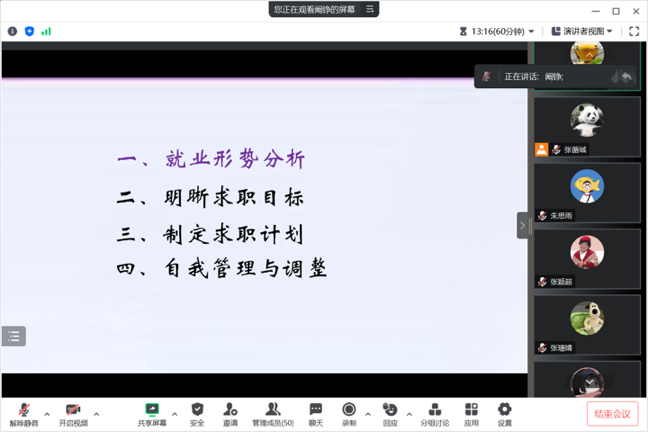 此次职业规划讲座让同学们进一步了解了目前的就业形势,更加明确了自身的就业方向和未来规划,增强了同学们就业信心和主动就业意识,同时为同学们提供了切实可行的经验方法,有利于同学们在接下来的求职生涯中调整好个人的情绪、心态和状态,勇敢地迎接就业挑战。