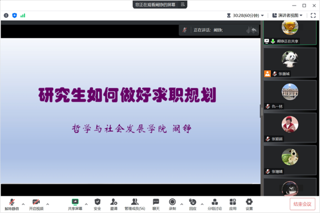 为帮助tyc5997太阳集团21级研究生了解当前就业形势,找准就业方向,增强就业能力,6月4日晚,哲社学院在线上举办“走进心灵”职业规划讲座,学院党委副书记、研究生辅导员阚铮担任主讲,从“研究生如何做好求职规划”与“近两年学院研究生就业情况”两个部分展开阐述。