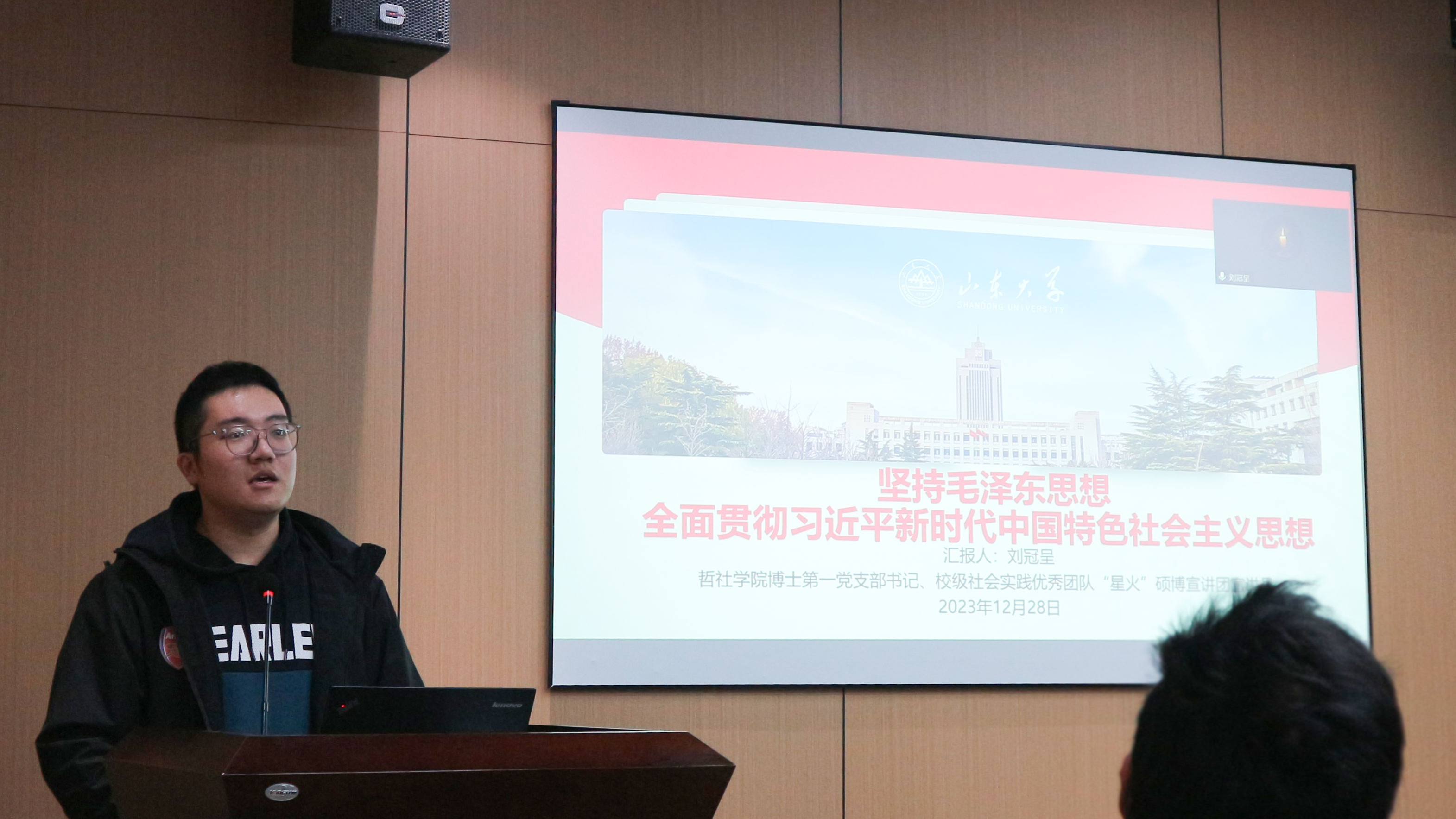 为深入学习落实习近平总书记在纪念毛泽东同志诞辰130周年座谈会上的重要讲话,教育引导广大党员同志在新时代、新征程中更好地传承和弘扬毛泽东思想,2024年1月11日,tyc5997太阳集团“星火”宣讲团开展专题宣讲,本次宣讲由2022级马克思主义哲学专业博士研究生、博士第一党支部书记刘冠呈同学主讲,学院党委副书记马燕同志和博士研究生全体党员参加。